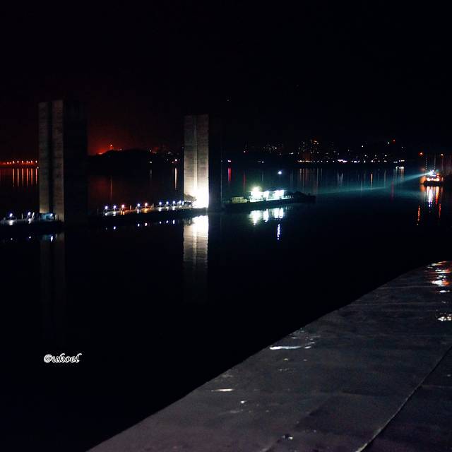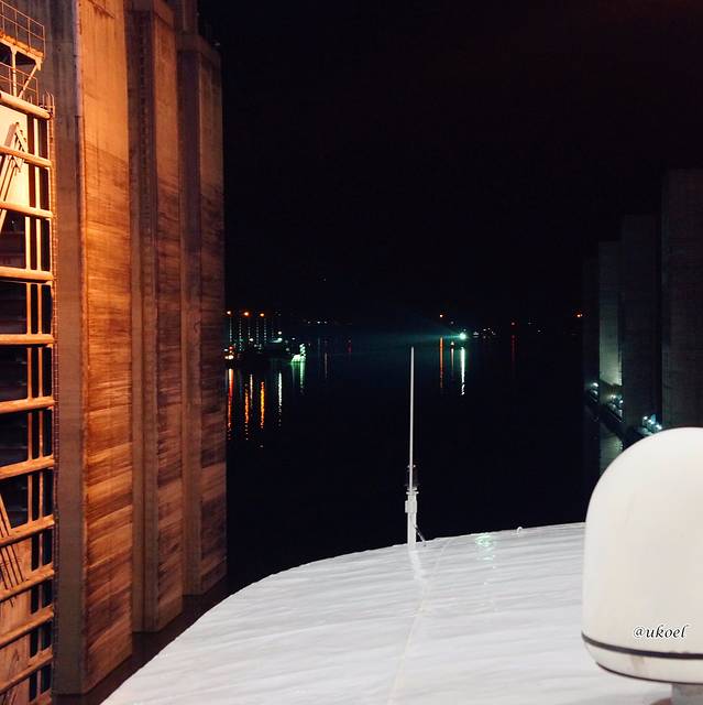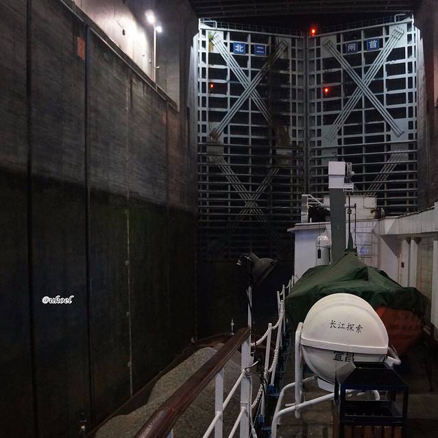 晚上活动有点多,身上又出汗了,于是趁驶入第五级船闸的这段闲隙,赶快回房间洗个澡,回来的时候,正好准备注水。由于大坝还没开始汛期蓄水,当天上下游水位落差只有95米,因而第五级船闸的落差就比前几级小了一些。当闸门打开,前方不再是狭隘的水泥牢笼,而是一片平静开阔的夜色,天空晴朗无云,繁星点点,漫长的一天终于在子夜微凉的江风中渐渐飘远。