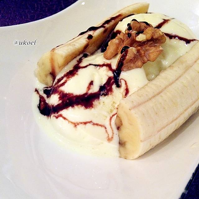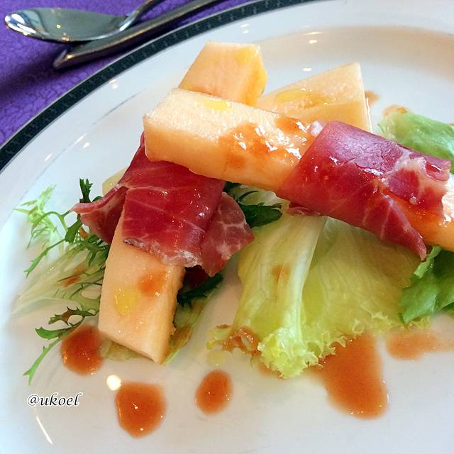 晚饭继续选择西餐。最有范的还是前菜的Prosciutto;牛肉清汤清得像一杯红茶,味道还算鲜美;主菜要了羊排,基本是全熟的,嫩度尚可,但略微咸了一些;甜品香蕉船有点凑数的感觉了,就是拿中午自助餐的水果和冰淇淋拼一下,不过船上能做到这个水平,也完全可以接受啦。