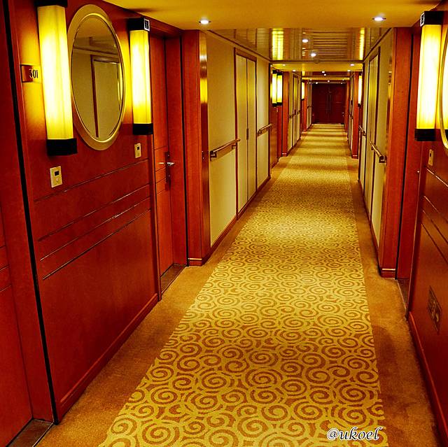除了稍显低矮,客房过道的布置已丝毫看不出是在船上,俨然一副五星酒店精致典雅的气派。