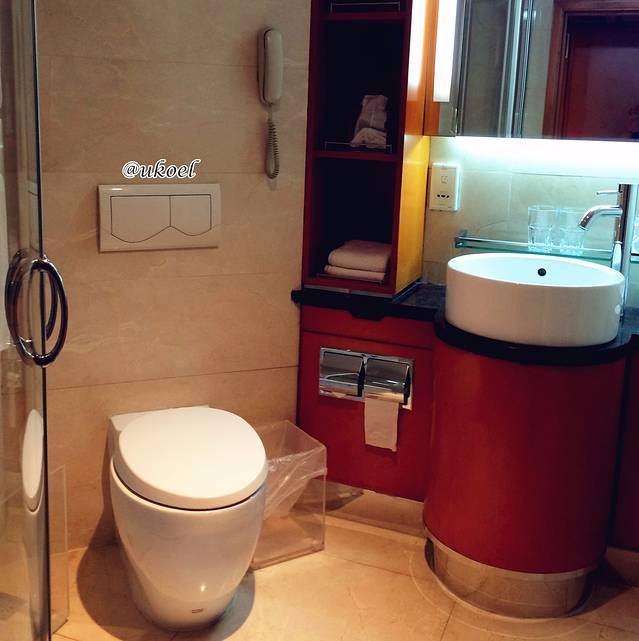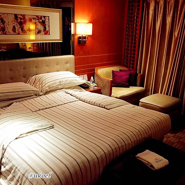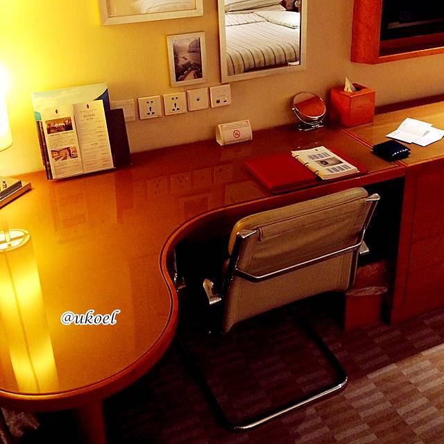 房间的布置低调而奢华,两张单人床拼成一个标准的Queen size,空间却仍不显得局促,宽敞的写字台,小冰箱、沙发、脚凳、床尾凳一应俱全;床品干燥、柔软和舒适;卫浴洁具毫不吝啬地使用了高端品牌,连纸巾都非常厚实;瓶装饮用水和拖鞋都是定制的,特别是拖鞋,还是彩色机绣的logo,很上档次;雨伞也都有配备。略有不足的地方是毛巾品质稍差;卫星电视频道太少且信号干扰很大;房内不提供茶包和咖啡;房内的玻璃杯质量太次,随手一碰侧向倒在桌上居然就碎了,害我赔了80块。另外房内是不能烧水的,需要热水或冰块可随时拨打60到前台,有人送到房间,这些服务员在带客入住时都详细介绍了。
