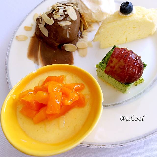 12点,午餐开始,自助餐的形式,延续早餐的风格,虽然没有任何惊世佳肴,但种类和色香味都在有限条件里做到了极致。今天喜欢的菜品有清蒸龙脷鱼柳、橙皮鸭胸和天妇罗,同时每天都有三四道不重复的精致甜品;冰淇淋略微简单,每次都只有香草和巧克力两种口味,好在没有忘记搭配各种topping。用餐环境则依然宁静整洁,给人一份闲适的心情,慵懒地看着两岸风光流淌在明亮通透的舷窗外。