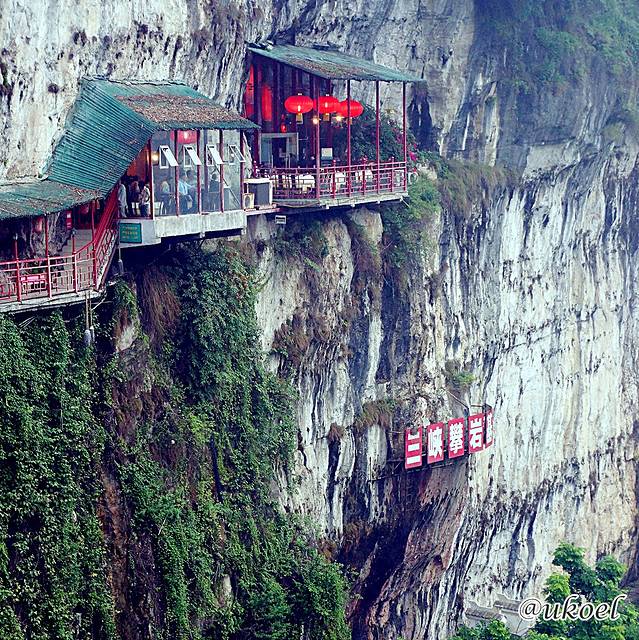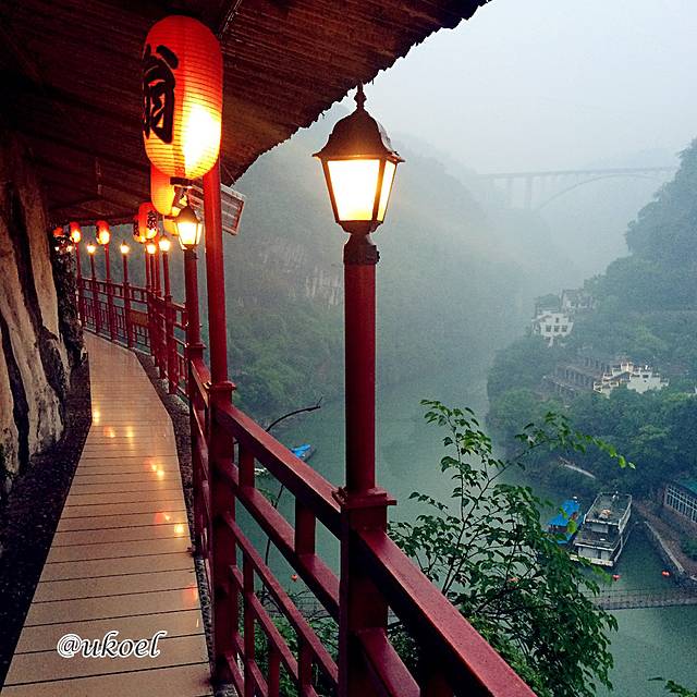 这一带属于南津关地界,也就是西陵峡东端的起点,因而四周已是山清水秀,在轻柔的雨雾中显得更加葱茏和缥缈。而放翁酒家就建在河谷一侧的悬崖上,进店后,需要通过一段悬空的长廊到达位于悬崖天然洞穴中的用餐区,靠悬崖一侧还有挑空的包房观景平台,临渊而坐,美景尽收眼底。