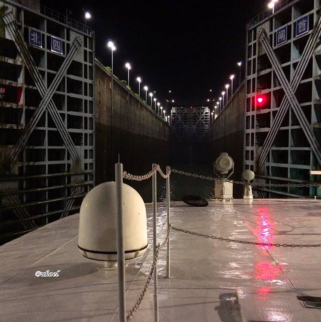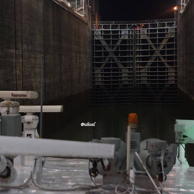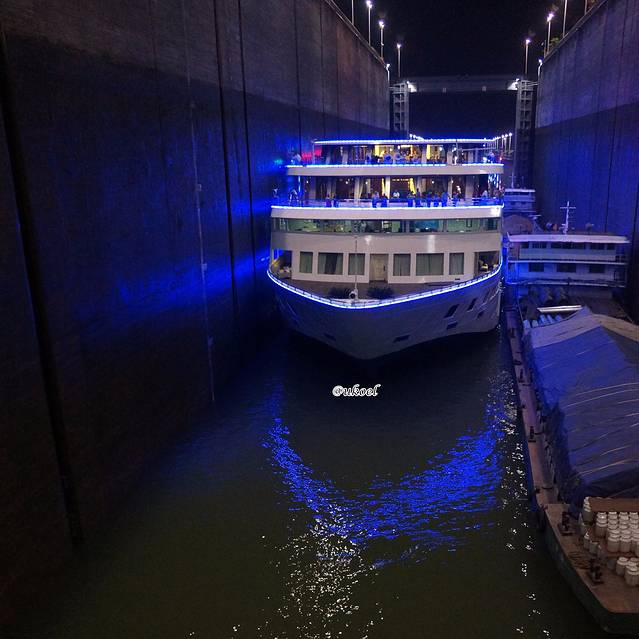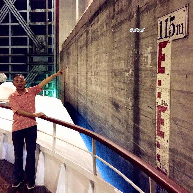 酒会时间不长,一眨眼到了7点,船方招呼大家去餐厅用晚饭。离开前去甲板上一看,发现船就停靠在闸门外,而闸首闸门已经关闭,也就意味着我们的船是下一批次的头船,这样就能最近距离观看闸门开闭的景象了。虽然由于晚饭时间而不得不错过进入第一级船闸的过程,但也无妨,整个过闸时间需要漫长的3个半小时,如果害怕无聊,个人建议只选择在过最后的4、5两级船闸时上甲板观摩,因为1-4级船闸的通行程序是完全一样的,而最后的第5级船闸开闸后就进入上游,与之前有所不同。正常情况过一道闸大约40分钟,大家可以据此估算时间。
