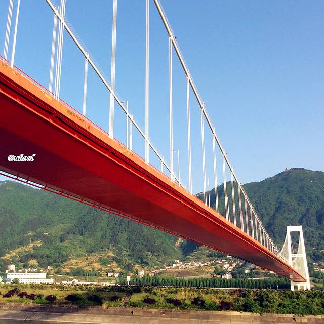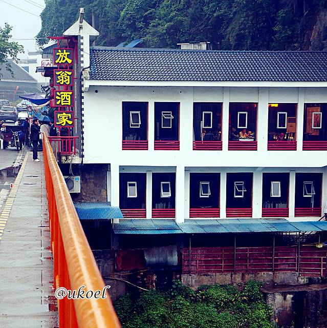 从宜昌东站一路开来路程不短,需要穿过整个市区,到处可见残破的山头和依山新建的高尚住宅。40分钟左右可以抵达我们今晚登船的桃花村码头,但为了吃晚饭,我们继续前行大约2分钟,来到三游洞桥头,放翁酒家的招牌已历历在目。