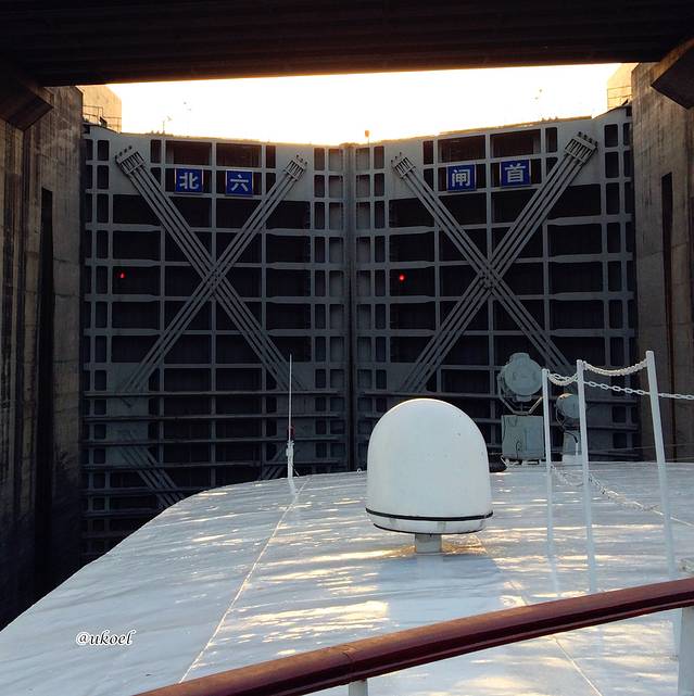 6点半,船在首闸外静止下来,开始排队入闸。三峡五级船闸的通航能力已非常饱和,每艘船过闸的时间和次序都是事先预约和排定的,如果错过,就需要重新申请。当闸门越来越近,那种魔域般强烈的钢筋水泥的压迫感乘着惶惶的暮色迎面而来,背后却依然是明艳的青山绿水。