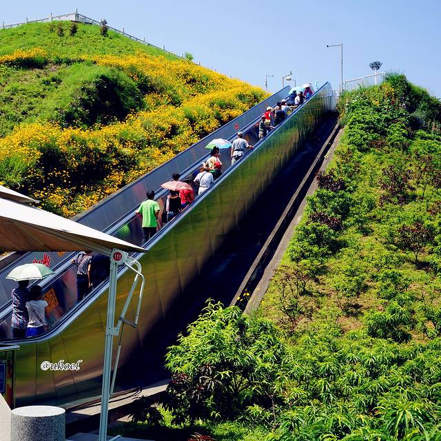 不一会儿就在坛子岭景区入口下车了,迎面而来的是滚滚热浪和曝晒在阳光里的多级登山电梯,不必汗流浃背,轻松地拐转几次就来到岭上的观景园。