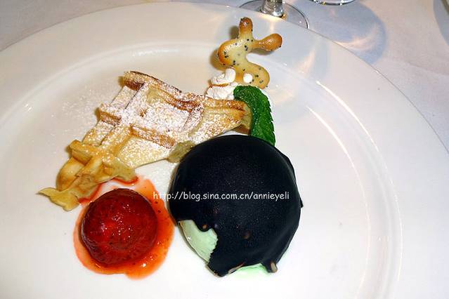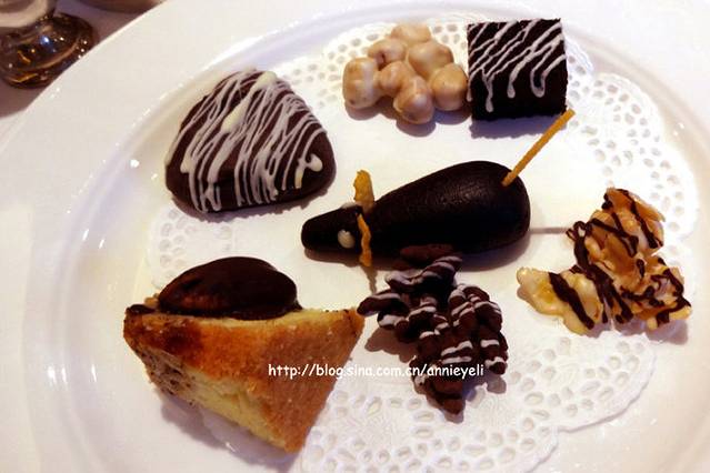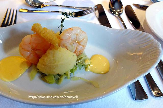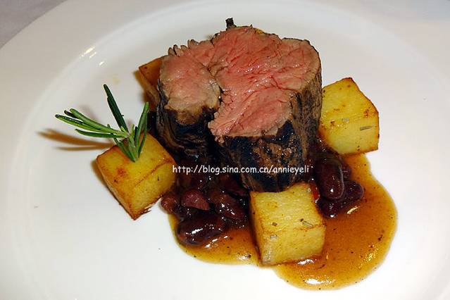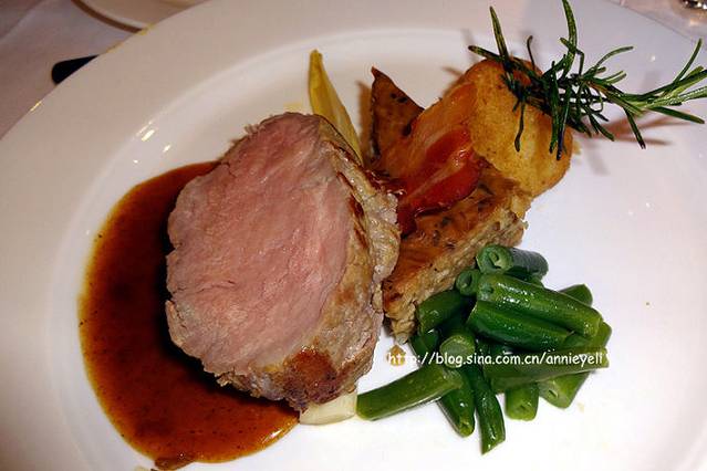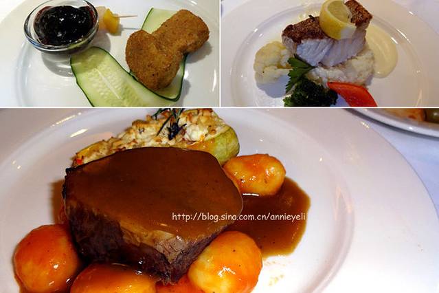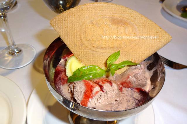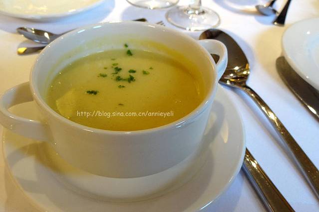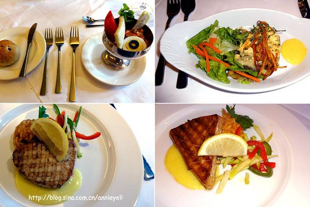 这晚我们又先从葡萄酒入手,然后依次而食开胃汤、特色前菜、主菜(鱼、牛排)、餐后甜点,最后是咖啡。
