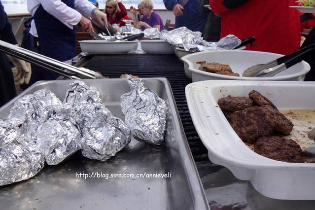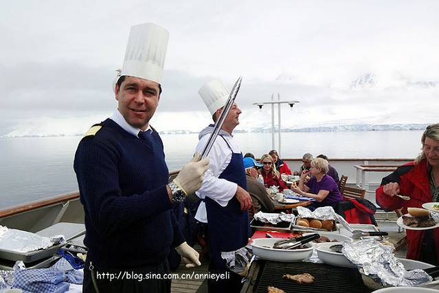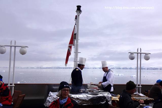 这天上午气象变换万千,船长为了安抚大家无法登陆皮特曼岛(petermann Island)的懊丧心情,宣布 BBQ自助午餐将在船尾的露天平台上进行!