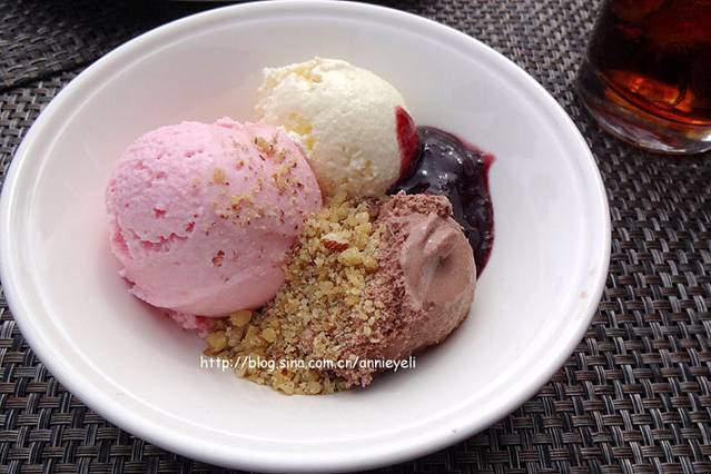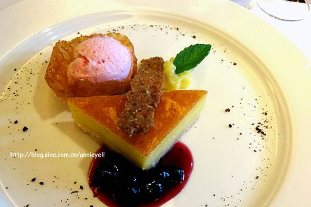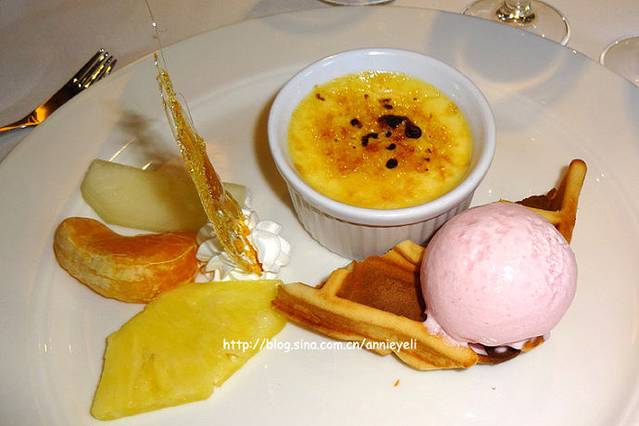 甜品当然要“冰火交加”的焦糖布丁(Crème Brûlée)、草莓冰淇淋喽。