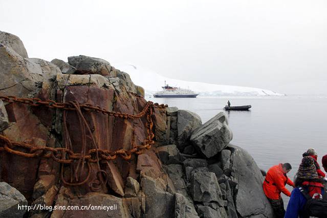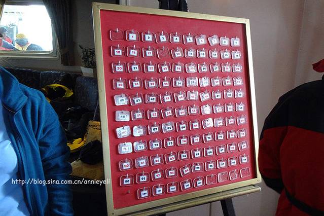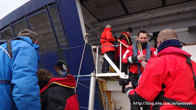 上南极陆地之前,我们有序地按照规矩行事:先把自己的号码牌翻个面(表示离船),然后走出舱门,大声报出自己的鞋箱号码,由船员协助取出各自的高帮靴。