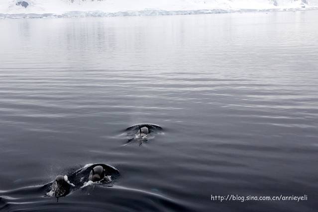 眼下,先锋探险队的橡皮艇在安沃尔湾(Andvord Bay) 遭遇到数条南极虎鲸(antarctic type a killer whale)。