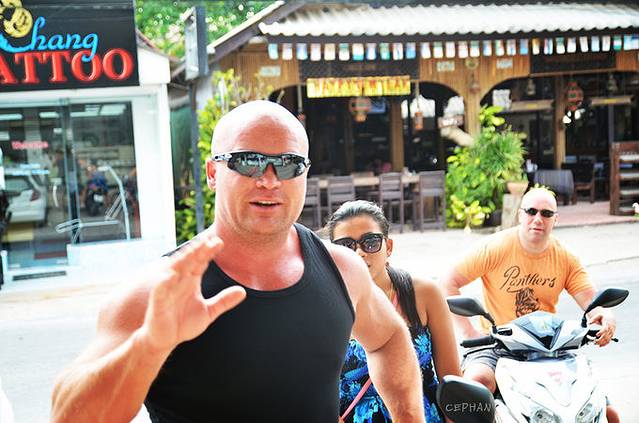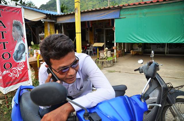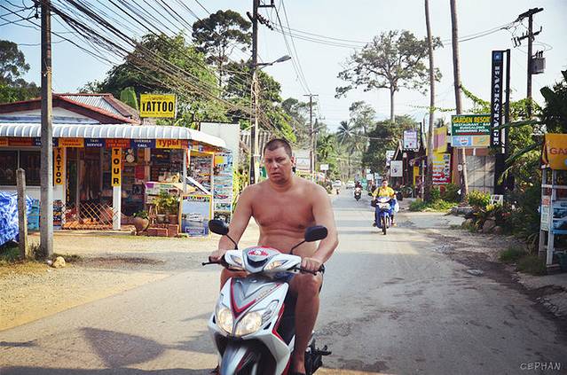 中午随便找了家餐厅,我们买好回曼谷的车票,小乐和阿疯照例骑摩托车带着我们,在象岛闲逛。