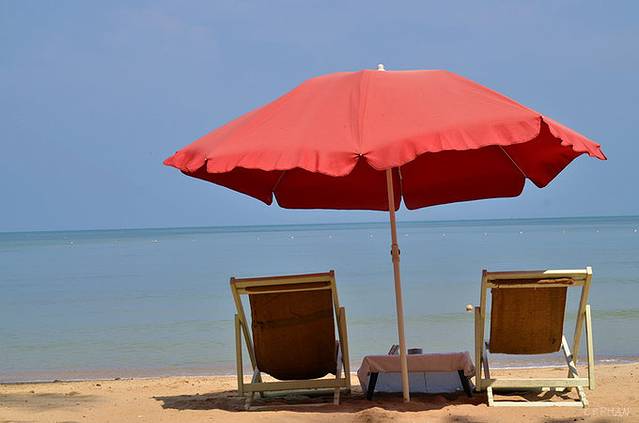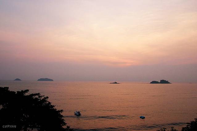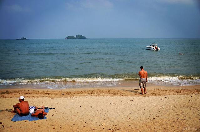 第二天起床,象岛天气不算特别好,浅蓝的天空总觉得被蒙上了一层灰灰的薄云。阳光努力试着伸出双手拥抱海岛,却总觉得不够直接、透彻。我和SU起床吃早餐,餐厅就在海边的沙滩上,直面大海,许多游客们已经开始在沙滩上享受日光浴。