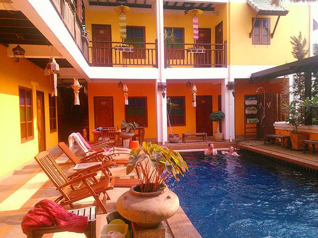 走出清迈机场,便有身着工作服的出租车公司人员前来询问,我们上了一辆黑色出租车,讲好价格为120泰铢,送我们到位于古城的Chiang Mai Boutique House。这是一家典型的泰北风格GH,座落在马路边,小小的游泳池里,几名欧美客人,三三两两。