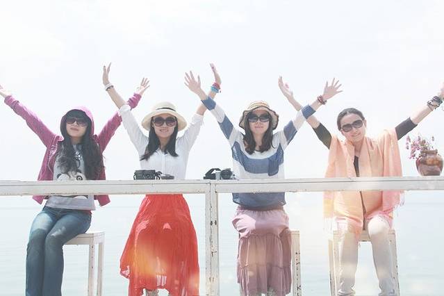 把相机放在桌上,倒数十秒,两边的女汉子要不停的来回奔跑摆pose完成四人自拍