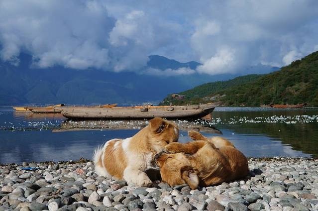 一直想看泸沽湖的日出,5点起床,屋外一片漆黑,且气温较低。虽然房间也能看到日出,为了最佳效果还是穿了加绒的冲锋衣,守在了湖边。可惜,云层太厚,没有见到想象中的日出,却看到了另一番景色。