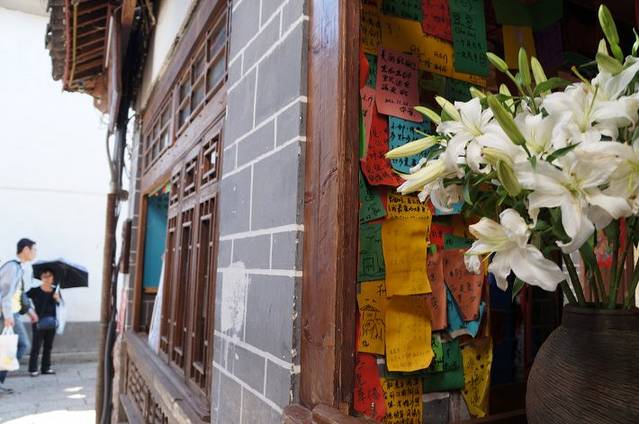许多馆子都贴满了游客留下的五彩卡纸