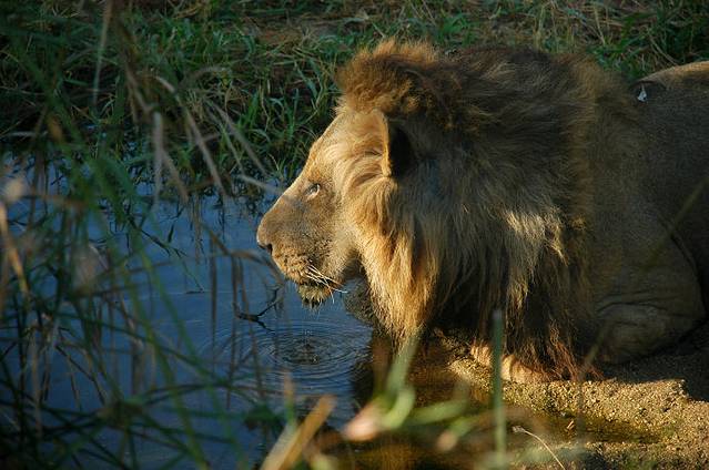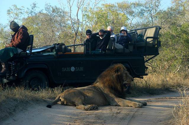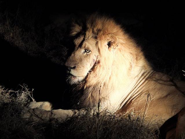 在萨比萨比,最难忘的是第二晚与狮子的亲密接触。那时天色已经全黑,头顶悬着漫天繁星,我们结束了傍晚猎游正在回赛拉提营地(Selati Camp)的路上。黑暗中只靠车头的大灯照亮前方路面,动物追踪者手持强光电筒左右扫射以观察周围是否存在危险。3小时的猎游让大家多少有些疲乏,车上四个人都很安静,黑暗的环境中嗅觉和听觉变得特别灵敏,早春微凉的空气混杂着非洲草原的味道,说不上清新却也算不上浑浊,风吹过草木沙沙作响,蛙叫也格外清晰。突然在寂静的氛围中车上的对讲机里传来了几句我听不懂的话,接着向导转头对我们说:“今晚有个惊喜等着我们!”当时我还只道是营地晚餐做了什么特别安排呢。及至车速慢了下来,强光电筒定格在前方,我才顿时惊觉,地上躺着的可不是一群(三四只)狮子嘛!我只想兴奋地尖叫,但还是克制地压低了声音,毕竟惊扰到狮子可不是什么好事。车子熄火停在狮群边上,距离如此之近,我伸出手应该就能够着下面那只母狮,这是我唯一一次在猎游时感觉到紧张,但看到整个身子都暴露在车外的动物追踪者依旧很淡定,又觉得自己有点少见多怪了。电筒直射向狮群,我小心翼翼地问,这么强的光它们能受得了吗?向导回答说狮子的瞳孔能够适应很强的光线,所以用电筒照是没有关系的。正说着呢,一头侧躺的母狮突然起身,抖了抖毛,着实把我吓得心怦怦跳,还好它只是缓步绕过车尾,在车的另一侧找了个地方又躺下休息了,莫不是嫌电筒光扰了它的清梦吧。唯一的一头雄狮虽然也趴在地上,但骄傲的头颅却仍然昂着,摇摇尾巴打打哈欠,惬意的很。向导指了指它滚圆的腹部,笑着说:“噢,它吃的真饱!”难怪这群狮子此刻这么安分,在吃饱喝足的情况下,它们看上去真像是温顺的大猫。但是在清晨早些时候遇到正在进食的狮子时,可就没人会这么想了,因为撕咬猎物而张开的血盆大口格外恐怖,警惕的眼神明摆着告诉我们生人勿近,与这会儿所看到的情形有天壤之别。在这万籁俱寂的夜里,我们一车四人与一群狮子静静地相伴良久,它们也许根本不在意,但这段紧张奇妙的经历在我的心中可是留下了难以磨灭的记忆。