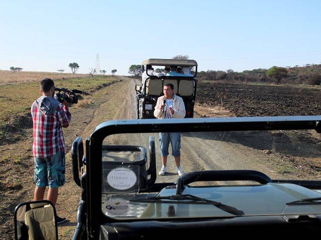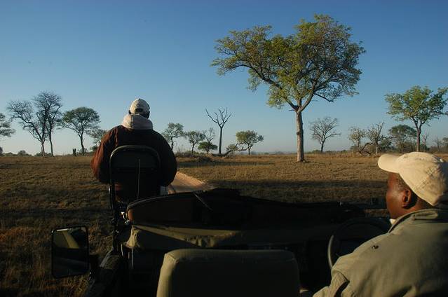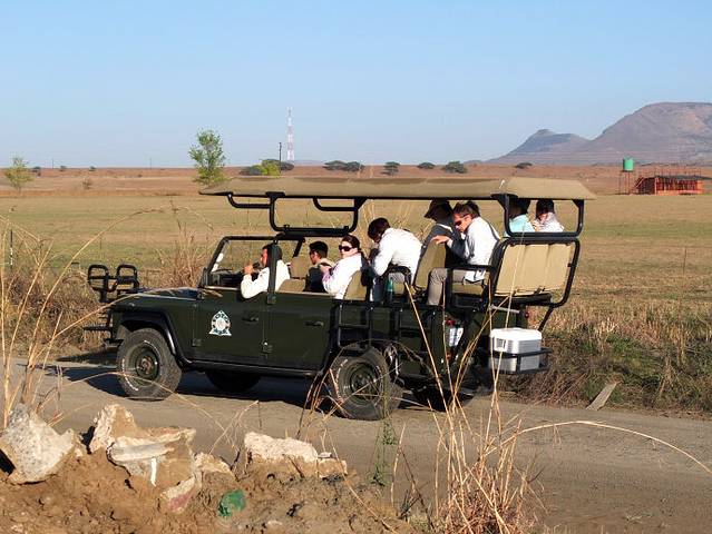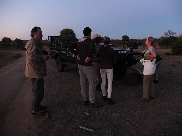 第一次是在Nambiti Private Game Reserve(纳姆比提野生动物自然保护区)进行morning safari(猎游)。这是我们来到南非的第三天,时差还没有完全倒过来,因此6点的叫醒安排对我们没有产生太大的困扰,再加上第一次safari的新鲜感促使我们早早地做好了准备,在餐车享用了一点饼干饮料后就匆忙下车,换上已经整装待发的敞篷越野车。早晨的风还是有些刺骨,开足马力的越野车一路奔驰驶向保护区,黄沙漫天发丝飞扬,等待我们的将是怎样的际遇?