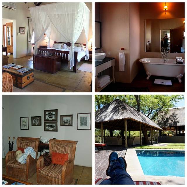 第二晚我们转移到赛拉提营地(Selati Camp)——“昨日”殖民地时代的重现。赛拉提营地共8间套房,散落在公共区域的一侧。走进我们的房间,但见一台踏脚缝纫机、两把藤条椅、旧式旅行箱,还有墙上挂的老照片、浴室里的四脚浴缸,当我把照片传到微信,眼尖的朋友立刻发现:这像极了电影《走出非洲》里的场景。没错,赛拉提名字的由来就是为了纪念1870年代修建的途径这片土地的同名铁路线。与小丛林营地一样,这里每套房也有室外淋浴区,清晨猎游结束后,我们趁着温暖的阳光体验了一番,大概是营地布局的关系,这里的私密性不如小丛林营地,室外淋雨的时候不时能听到经过的游客对话,尽管有高高的围墙遮挡,还是让我略感不自然呐。