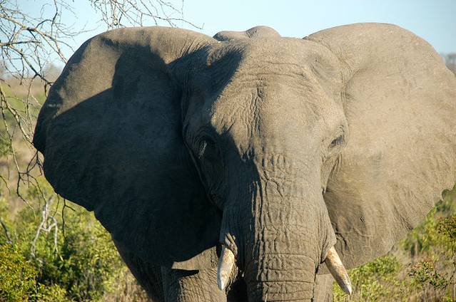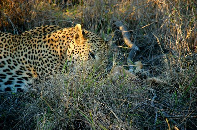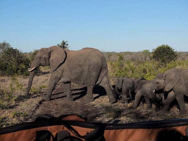 猎游是一件特别讲究缘分的事儿,精彩照片上定格的那些瞬间更是可遇不可求,如果有可能,自然是猎游次数越多,撞大运的机会越多。在萨比萨比,我们虽然未能亲历猛兽捕食或打斗的场面,但至少非洲“五大”都见识全了。大象和犀牛比较容易遇到,既有落单的也有成群的,他们一般都很安静,行动也很迟缓,一刻不停地在吃树叶/草。向导说大象的消化效率极其低下,因此每天需要吃几百公斤的食物才能满足身体所需,路上随处可见的枯枝断根便是它们留下的“残羹冷炙”:象鼻子把新鲜枝叶卷起,边吃边走,叶子吃光了,枝干就被随意抛弃在路边。相反,犀牛由于骨骼构造的原因,头颈总是垂向地面,所以选择面就窄了许多,只能以地上的草为食了。