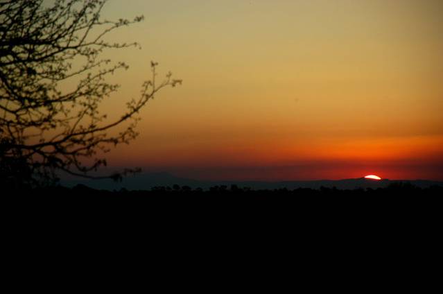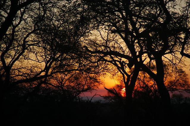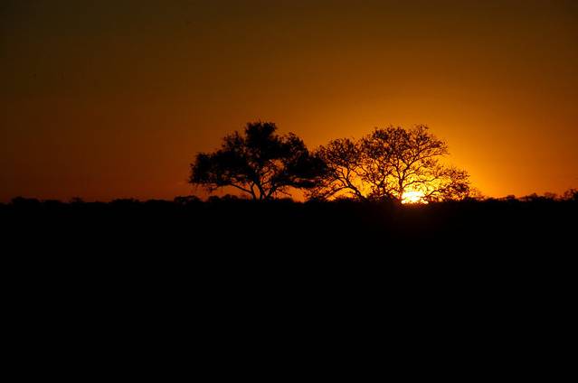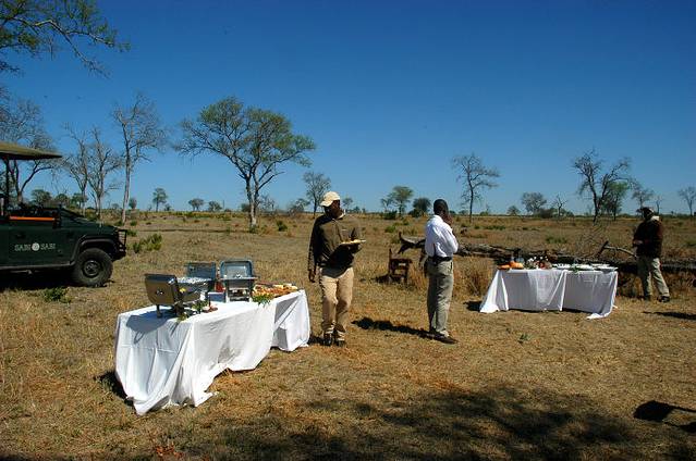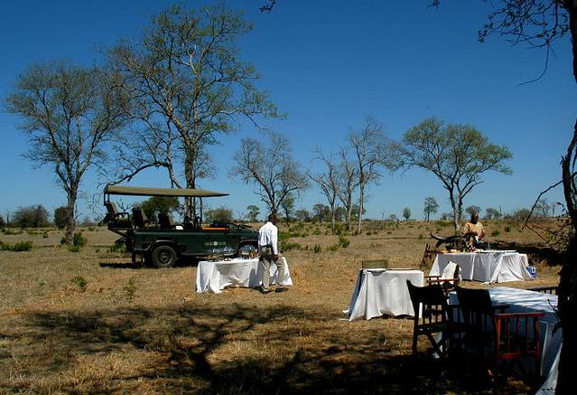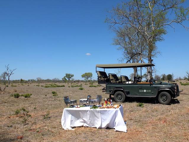 萨比萨比的餐食服务带给我们的体验丝毫不逊于猎游。刚到小丛林营地用午餐时,就有侍者过来记录我们sundowner时的饮品,当时还傻乎乎的不知道何为sundowner drink,一脸茫然,邻座住客好心地向我们解释:他是要你们选择傍晚猎游休息时享用的饮料呢。原来如此,不过那时舟车劳顿,午饭又刚下肚,我特没创意地点了矿泉水,侍者估计也觉得不可思议,还跟我重复确认了一遍。果不其然后来我就后悔了,之后的猎游我果断选择了香槟,这才符合当时的气氛嘛。Sundowner是傍晚猎游时的休闲放松时间,在太阳落山时分向导会把车停到一片视野良好的平原,架起车前的挡板,摆上小吃和自选饮品,整车人全部下车,活动一下筋骨,欣赏欣赏壮丽的非洲落日。同时这也是和同伴及向导交流的好机会,在小丛林营地与我们同车的是一家四口英国人,中年夫妇加上一双成年儿女,平时分居三地,这次难得全家出游,他们已经在小丛林营地住了三天,第二天就要转移到大地营地去了,听说我们只在萨比萨比待两晚,忍不住惋惜,哎,他们不能理解年假少的悲哀啊。在赛拉提营地,我们很幸运地独占一辆车,因此能与向导充分交流,嚼着比尔通(Biltong,南非特产生肉干),向导Lee聊起他的选择,说护林员的职业上升通道太窄,他希望成为一名野生动物医生,因此来在这里工作,不仅能多接触动物,还得存钱赚学费。其实我们也很希望能与尚干族动物追踪者多聊聊,相信他们一定有更多有意思的故事,可惜Mike生性腼腆,又总是在停车时到周围散步(Lee说那时他的习惯),所以临走也没能和他说上几句话。但非洲如血的残阳美的那么惊心动魄,能把这些小小的遗憾都抹去,只留下美好回忆。