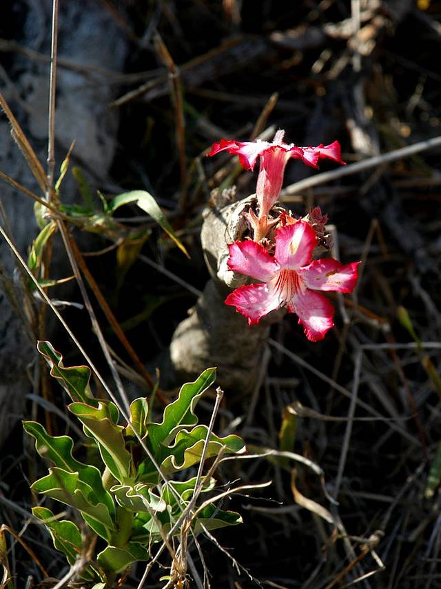 徒步猎游要避开大型野生动物,确是接近各种非洲植物的大好机会。也许是为了免遭动物的毒手,这里的许多树枝上都生有刺,我在萨比萨比第一次猎游就中了招,越野车穿过低矮的树枝时大家纷纷偏向车中间低头避让,没留意树枝被刮到车座上,等我挪回原座,屁股上结结实实地被扎了一下。所以徒步的时候我就特别小心,长裤长袖包的严严实实,不过看Lee倒是一身短打,轻装上阵。我们一边走着,Lee一边介绍周围的各种植物,比如南非特产Marula酒,就是从Marula树的果实中提取的。再比如某种树叶可以用来泡茶,他摘下几片叶子放在手心搓了搓递给我们,确实闻起来有股清香。我们现在用到的生活用品,在大自然里都能找到,Lee边说边从一棵树上摘下一段枝条,然后不知怎么从一头分出许多纤维来,比划着刷牙的姿势,告诉我们:“看,这种树以前就被当地人用来当牙刷的。而牙膏呢则取自另一种树。”我不知是该感慨大自然的丰富馈赠呢,还是该感慨人类的聪明才智呢。继续向前,Lee指向远处一丛红白相间的花,在一片枯黄的草地上特别惹眼,走进细瞧,花朵分五瓣,边缘一圈为深粉色,逐渐向里过渡成白色,非常漂亮。Lee说这叫因帕拉百合(Impala Lily),有剧毒。乖乖,还好我没有手贱去碰它,不知道这名字的由来与同样叫Impala的动物是不是有什么渊源。