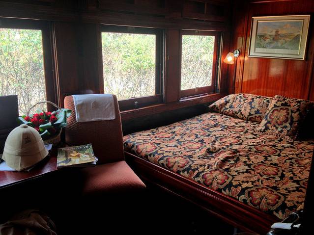非洲之傲的创始人Rohan Vos先生致了简短的欢迎词之后,每一位宾客便由专属的服务生带领着登上列车,入住各自的包厢。与白色墙壁浅色家具搭配出的敞亮明快的候车室相比,列车内部红色木质内饰和墨绿色地毯构成的主色调显得更加深沉稳重。非洲之傲列车以宽大舒适的私人空间著称,一节车厢由2-3个包厢构成,几乎每个包厢都有一张King Size的大床和独立的卫生间/浴室,行李架、衣橱、写字桌、迷你吧一应俱全,最有特色的是五扇可以完全开启的窗户,让人无论身处何处都不会错过窗外美景。