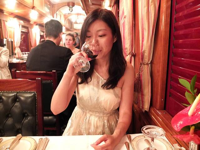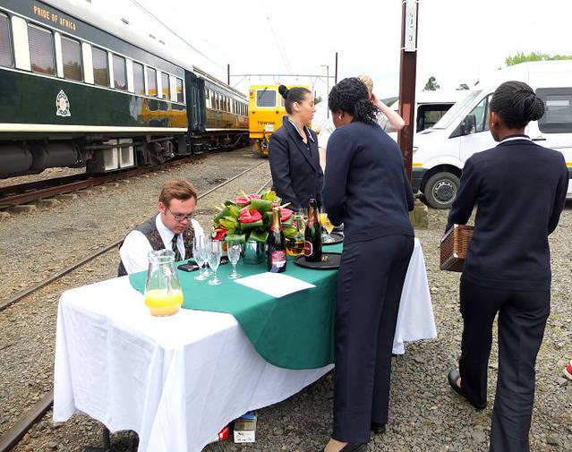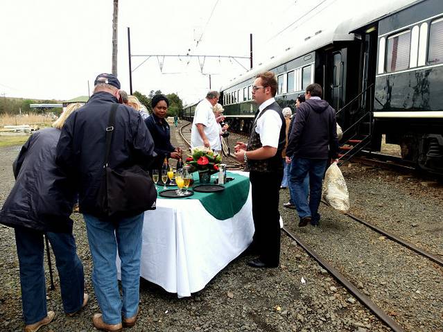 如果说非洲之傲奉上的各色佳肴不亚于任何一家高级餐厅,那么它提供的丰富美酒恐怕要超越绝大多数餐馆了。这里不仅有多种葡萄酒可供选择,更有专门的侍酒师为宾客服务,我们这趟列车上的侍酒师Peter(拖延症的后果,不太确定名字拼写是否正确)就是这样一个可爱的小伙子。每到午餐和晚餐时,Peter会挨个儿来到每一桌跟前,为宾客推荐佐餐酒,前菜、主菜、甜点各自都有不同的搭配,而每一次他总是不紧不慢地以一句“May I present you this Chardonnay / Sauvignon/…”开场,接着用同样略带拖沓的语调介绍一番香味和口感,然后在我们的杯中倒上一点试饮,若是觉得适合自己的口味,Peter便会爽快地添满大半杯,若是不喜欢,也大可以请他推荐别的酒款。如果对酒还有什么疑问,Peter都会热情耐心地回答。无奈过同学和我都不是懂酒嗜酒之人,几杯之后大概Peter也观察到了这一点,所以后来用餐时,他都会贴心的为我们少倒一些,以免我们压力过大。