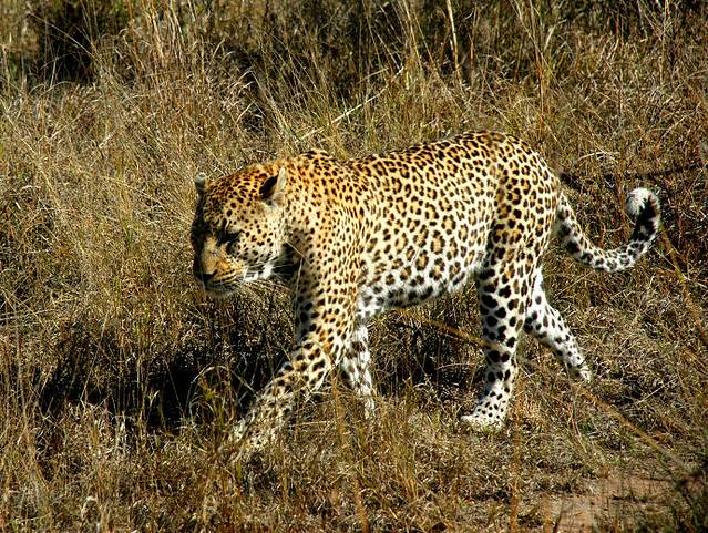 而其他三大(花豹、野牛、狮子)可难寻多了,我们在非洲之傲沿途的那一次猎游就无缘一睹它们真容。据说萨比沙地是花豹出没较多的地方,我们也幸运地遇到过两次。一次是在傍晚猎游,我们驱车赶到时,太阳还没有落山,一头花豹正隐蔽在还未返青的枯草丛中大快朵颐。大概这头猎物已经供它享用几天了,这会儿我通过它嘴边的那块皮肉并不能辨认出究竟是那种动物成了它的口中食。第二次照面是在另一次清晨猎游,我们乘坐的越野车跟在一头悠闲散步的花豹后面慢慢挪动,它倒也不在意发动机的声音,自顾自地沿着土路踱步,不一会儿又钻进灌木丛。我们的越野车也毫不含糊,直接压倒低矮的灌木和细幼的枝干追了上去,不过总归不及花豹的玲珑身材,车子被挡在了草木茂盛粗壮的地方,我们也只能眼睁睁地看着花豹离去。野牛就更罕见了,四次猎游,统共就见过一次,真可谓是惊鸿一瞥。不过它们总是群体行动,我们见到的那一群,大概就有十几二十头吧。虽然体型庞大,但野牛移动起来非常迅速,在有限的接触时间里,我按下了多次快门,但拍出来的照片不是焦点跑虚了,就是好不容易框住的构图被主角给破坏了,回来竟挑不出一张满意的来,好生遗憾。