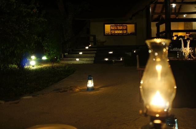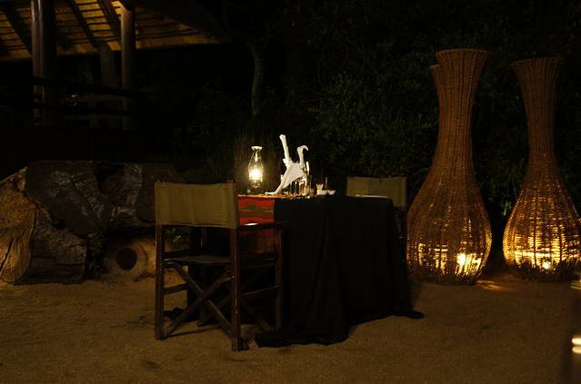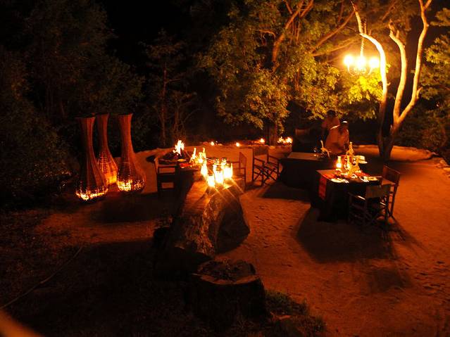 Sundowner好比开胃菜,篝火晚餐才是重点。与在非洲之傲上一样,萨比萨比的晚餐也是隆重而丰盛,但不同的是这里的气氛。萨比萨比的晚餐通常在营地公共区域附近的露天场所进行,他们把这块地方称为BOMA。当我们从猎游返回,这里已经生起篝火,摆好桌椅,点上蜡烛,周围晚风过境,树影婆娑,坐于其中的人们也暂时脱离了各种现代属性,融入自然的和谐中。萨比萨比的主菜也别具特色,比如黑斑羚肉、捻角羚肉,当然这些可不是取自保护区里我们猎游看到的野生动物身上,而是由饲养场特别供应的。每天这样大吃大喝终于把我们撑足了,最后一道甜品实在没有空间容纳,我们请向导提前护送回房,Lee大笑道:“萨比萨比的伙食太好了,我们都管这叫‘萨比萨比式填鸭(sabisabi injection)’,稍不注意身材就走样了。”