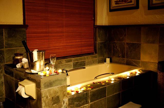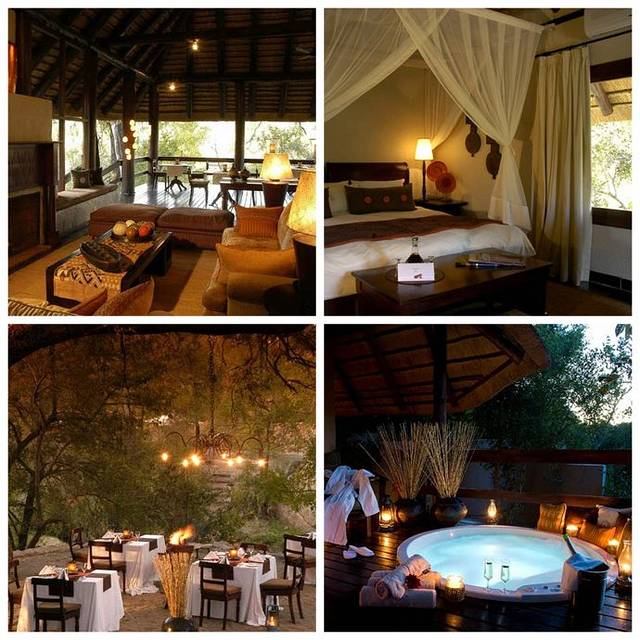 小丛林营地(Little Bush Camp)是我们在萨比萨比的第一站,表现的是具有现代气息的“今日”主题。一路从机场风尘仆仆赶到这里,下了车我们愣是没发现营地在哪里,终于在沿着一条隐秘的木板小径拐了个弯之后,眼前豁然开朗:开放式的营地公共区域没有墙壁没有门窗,只靠脚下的木头地板、头上的茅草屋顶和一圈低矮的木栏杆营造出一个空间,供住客休憩、用餐。栏杆外面就是树木、草丛、沙地、小溪,猴子偷面包的故事就发生在这里。小丛林营地是萨比萨比规模最小的营地,一共只有6间独立套房,一字型排列在公共区域两边,因此也最为安静私密,我们在房间里休息时,丝毫不会察觉到其他客人。最特别的是每间房的露台都配有热水按摩浴缸,因为天有些冷,我们晚饭后没有去露台,第二天早上发现按摩浴缸里竟有满满的热水,还在不断翻腾,真是悔得我肠子都青了,要是晚上能泡在露天浴缸里边喝气泡酒边欣赏满天繁星多浪漫!哎,现在只能看着宣传图片过过眼瘾咯。当然啦,没去露台还有一个原因,那就是晚上一进房间发现服务生已经把房间装点了一番:半浴缸热水、一瓶冰镇气泡酒、一对香槟杯、还有花瓣到处撒,等我兴奋地研究完一遍,倒也确实不早了呢。