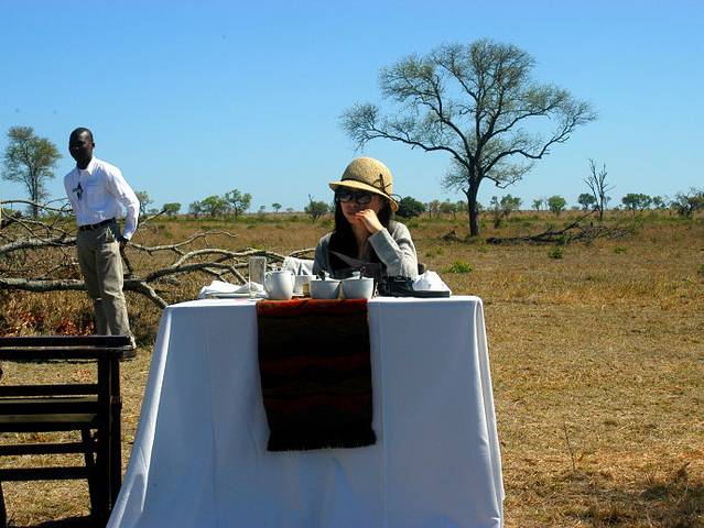 不过我们最大的惊喜不是来自丰盛的晚餐,而是在小丛林营地住宿时享用的一顿简单早餐。精致的菜肴丰富的菜式早在我们的预期之中,但这顿早餐的安排却大大出乎任何人的意料,包括已在小丛林营地住了3天的英国人一家。当我们驶入一片平坦草地,眼前出现的场景让车上6个人同时发出惊呼,不是见到了什么稀奇的野生动物,而是发现营地特意开来一辆越野车,把我们的早餐搬到了这里!我迫不及待地跳下车,只见洁白的桌布、成套的餐具、果汁奶酪蔬菜鸡蛋一样不少,尽管远离营地,却一点也不将就。坐在烈日下迎着耀眼的阳光,我不得不戴上草帽和墨镜来享用早餐,甚至一度还有一只斑马在不远处经过。然而蓝天白云之下黄土枯草之上,开阔天地间我自独坐当中,不用回看照片我也永远都不会忘记这份感觉。营地工作人员笑语盈盈,想必这不是他们第一次为住客制造这番惊喜,但一定每次都会因为住客的赞叹而充满成就感吧。如果说非洲之傲给了我意料之中的满意,那么在萨比萨比,我则收获了超过预期的感动。