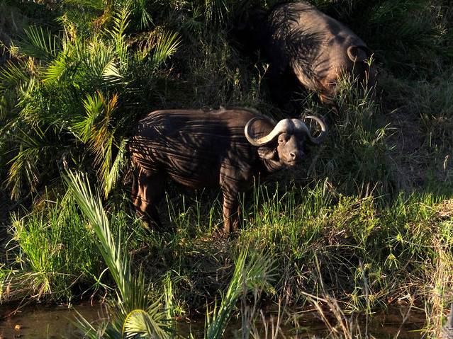 我们第一晚住宿在小丛林营地(Little Bush Camp),虽然到达时已是下午2点多了,但营地还是为我们准备了丰富的午餐。我们刚在半开放式的餐厅坐定,这里真正的主人就来宣誓它的“主权”了:两只藏身树枝中的猴子以迅雷不及掩耳之势从我们邻桌用餐布包好的面包篮里偷走了两块面包,给初来乍到的我们一个下马威。工作人员在向我们介绍注意事项的时候也特别提到,由于营地与与保护区之间没有刻意设置防护围栏,因此天黑之后如要外出,一定要通知他们派专人护送。稍事休息之后,两天四次精彩的猎游就此拉开序幕。