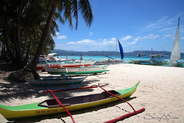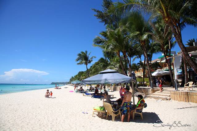 早上7:00出发,乘大巴往宿务(200P),车程4小时。下车的地点是宿务的汽车北站,转乘出租车到机场(170P)。乘坐宿务14:05航班到长滩,约1小时到达。长滩有2个机场,一个是Caticlan机场,另一个是Kalibo机场,一般从宿务过来等小飞机都在Caticlan机场,如果往返马尼拉的打飞机,一般就停Kalibo机场。这个要事先在机票上确认好,以免搭乘飞机的时候走错机场了。在Caticlan机场下机后,购买摩托、船的联票,50P。之后直接接驳到码头上船,到长滩岛还要缴纳进岛费和环境保护费,总共175P。离开的时候还得再交离岛费,真心感觉这费用挺坑的。下船后乘摩托直接到No.3 Station。长滩岛总共有No.1 - No.3三个Station,其中No1.Station开发最早,商业化酒店最多,价格也最贵。而No.3 Station有很多经济的旅馆,而且小食店、工艺品店最集中,我们就选择在No.3 Station附近住了。晚餐可以试试海边的自助餐,450P/人,有包括鱼、虾、蟹等的很多海鲜可供品尝。晚餐后海滩边漫步,购物。