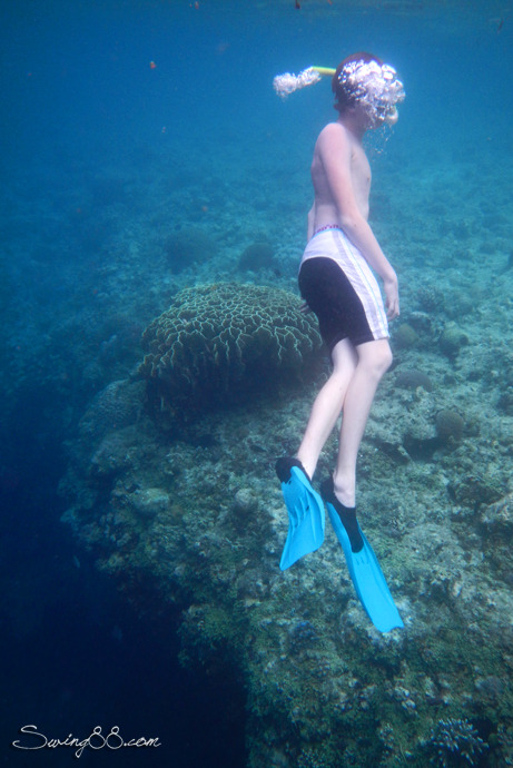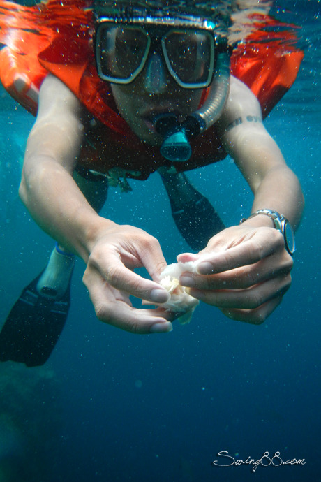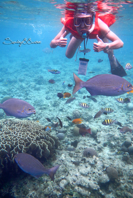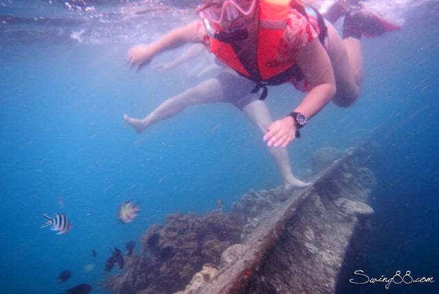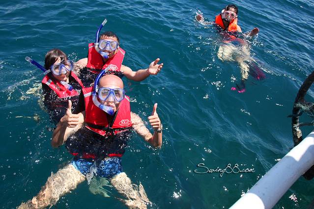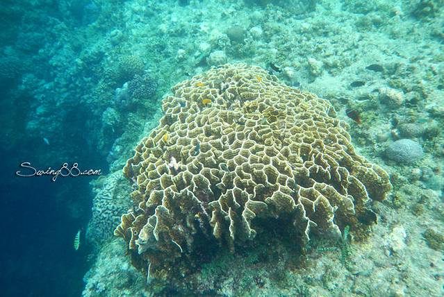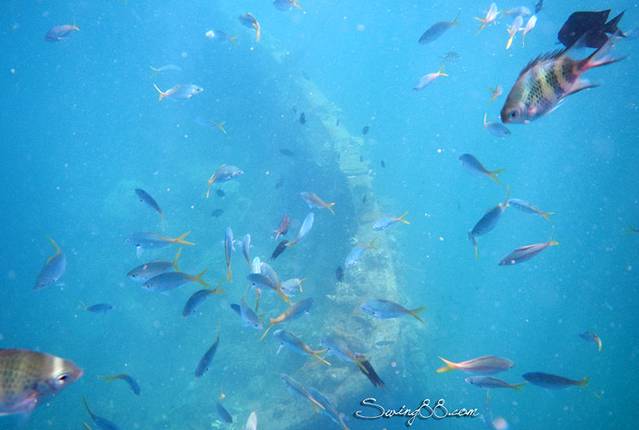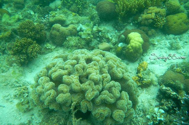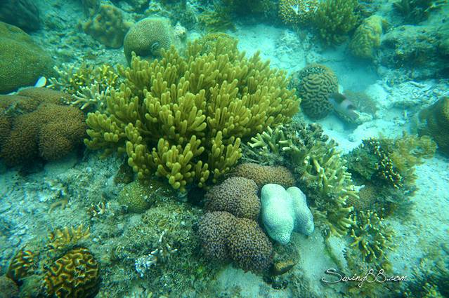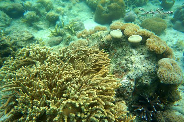 早餐后,也是包船出海,不过据船家说,今天的景点路程较远,所以船费要比昨天的贵,费用是3500P包船一天。到珊瑚花园 ( Coral Garden )、吕宋沉船(Lusong Gunboat)、East Tangat Gunboat浮潜,感觉真的太棒了!珊瑚花园是一大片的海底珊瑚,五颜六色美不胜收,后面是2艘二战时候的日本军舰沉船,离海面只有几米的深度,浮潜就可以近距离观赏到沉船。中午买好海鲜给船夫在船上加工,在Calumbuyan Island 岛上午餐。上岛费总共是150P/人。