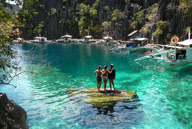 除却潜水资源,就得说说科隆的美景了。这里也被许多旅行者誉为世界最后一片净土。来到了科隆,绝对不能错过的是有着“菲律宾最干净的湖”之称的——镜湖(Kayangan Lake)。镜湖湖如其名,像一面清澈的镜子,从岸上就可以直看到湖底,各种鱼群在湖中畅泳。爬上半山腰,俯瞰镜湖,它的色彩立即就会把你镇住,那是一种魔幻般的蓝,在四周是浅色的一圈,仿佛一条浅蓝丝带,轻巧地将中间一块深蓝色宝石环抱。看得久了,人就觉得眩晕,仿佛那湖的颜色在不断变换,而且有奇异的光芒。这是一个魔湖。