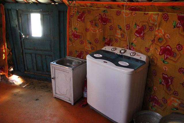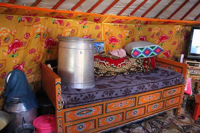 蒙古包的门都很矮,需要弯着腰才可以进来,进来之后,里面别有洞天。地上铺着厚厚的毯子,墙边也围着厚毯子,里面的家电一应俱全,液晶电视里面播放着翻译过的韩国连续剧,真搞不懂,他们怎么那么喜欢韩国连续剧,而家具更具蒙古特色,光线更是好,虽然已经很晚了,包里还是很亮。看到我们来了,女主人匆忙的在收拾着卫生,看来真的是淡季到了,除了我们,今天,这里不会再有别的游客了~