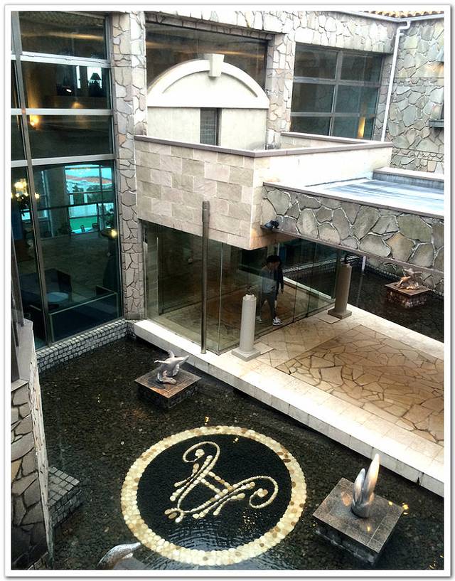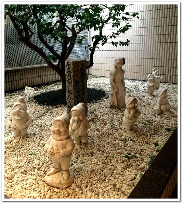 在“白雪公主与七个小矮人”的雕塑中,有一块天皇皇后莅临此酒店的纪念碑。