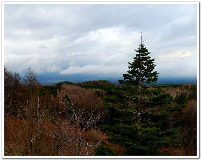 富士山五合目还没有开放,游客只能到达四合目隐隐约约观看河谷里的景色。