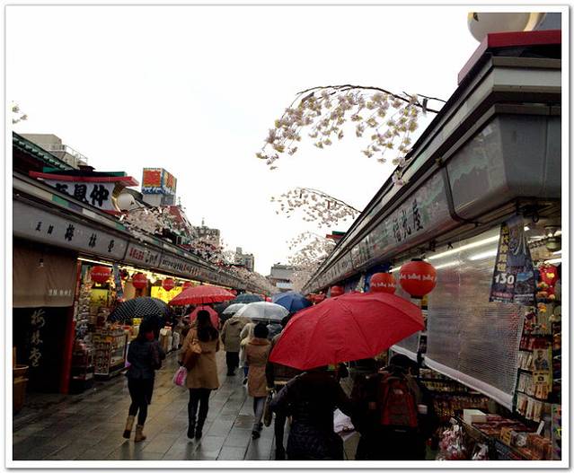 进了雷门顺着通往庙宇的道路上,有一条长约250米的商店街。漆成红色带有江户风情的小店排列在道路两旁,前来参拜寺庙和购买礼物的游客来来往往热闹非凡