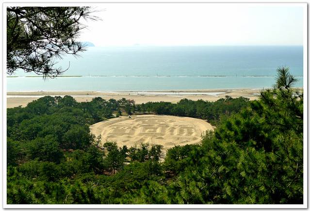 观音寺市内琴弹公园内著名的“钱形沙绘”。削面上刻有代表观音寺市的“寛永通宝”图案。