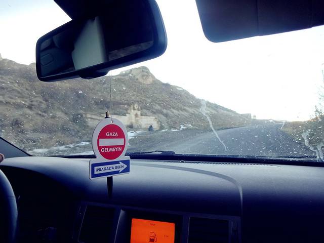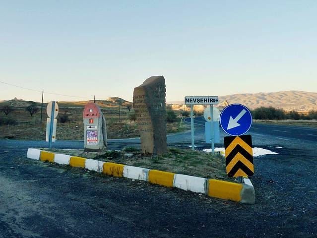 在谷底走了三个多小时,走错路一次,绕路一次,幸好都用着iPhone的指南针走回来了,终于走到了平地,并遇到了人。三个西班牙的自驾者,让我搭她们的便车去附近的 Honey Valley 和巴士站(可以搭车回Goreme镇),眼看着日落时分将至,我就上了她们的车,一路颠簸着离开了玫瑰谷。
