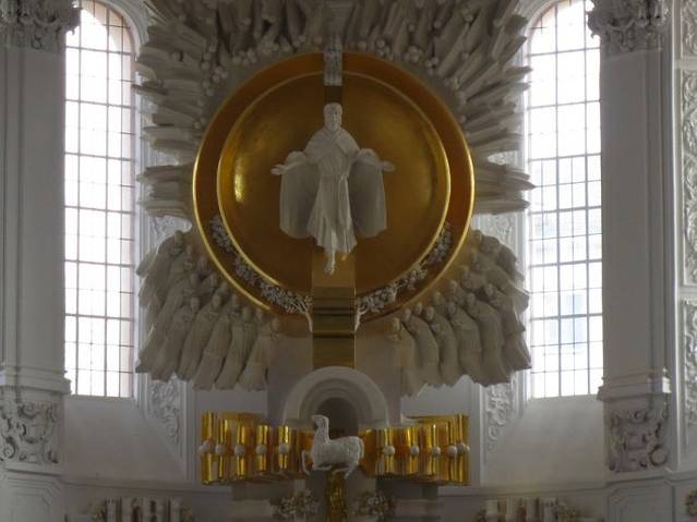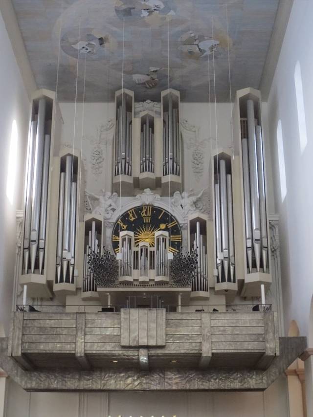 教堂里不可或缺的管风琴,只是不明白何以如此现代的结合了电子钟,也许是演奏的音乐需要不差一分一秒?管风琴的上方是不同颜色的绘画,区分出不同的区域。