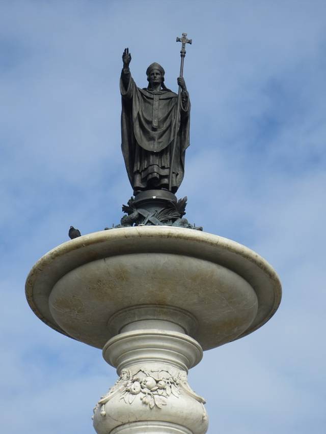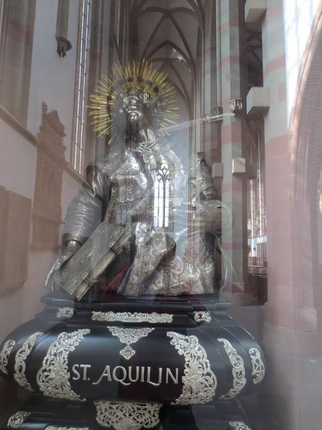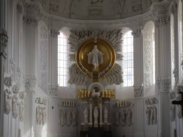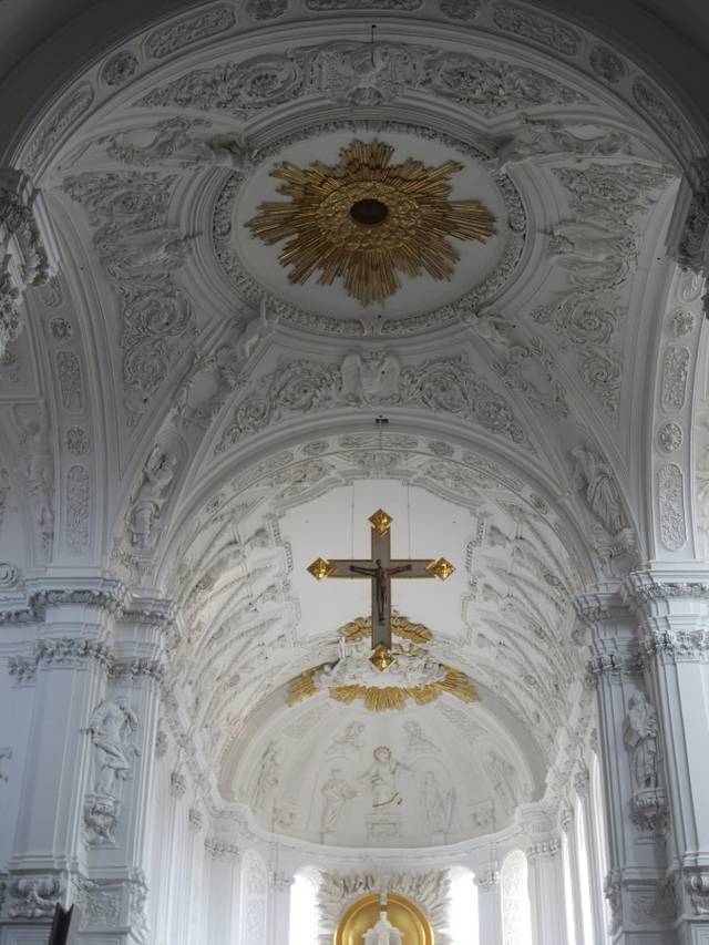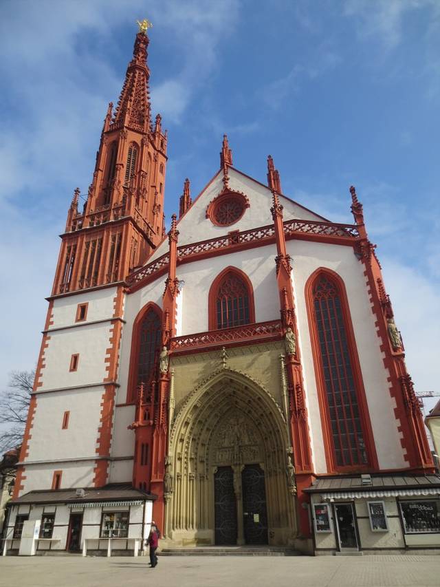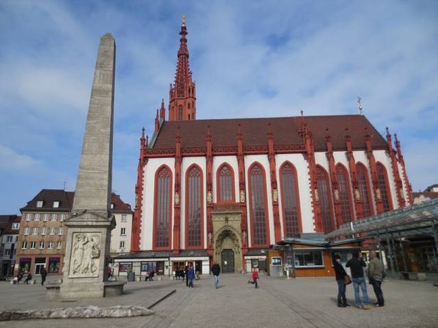 集市广场上远观玛丽恩教堂,蓝天白云下教堂显得很壮美。我就是从正对广场上的这个门走进教堂的。广场上立着一个方尖碑,不明白方尖碑为什么会出现在这里。维尔茨堡不愧是“小布拉格”,不但古美茵桥(老桥)与布拉格的查理大桥相似,就连这座教堂前方尖碑出现的位置与方式都与布拉格城堡圣维塔大教堂前的方尖碑一模一样,仿佛孪生兄妹一般。