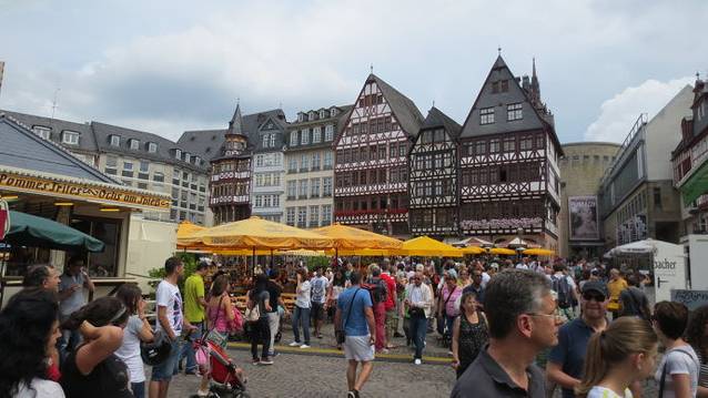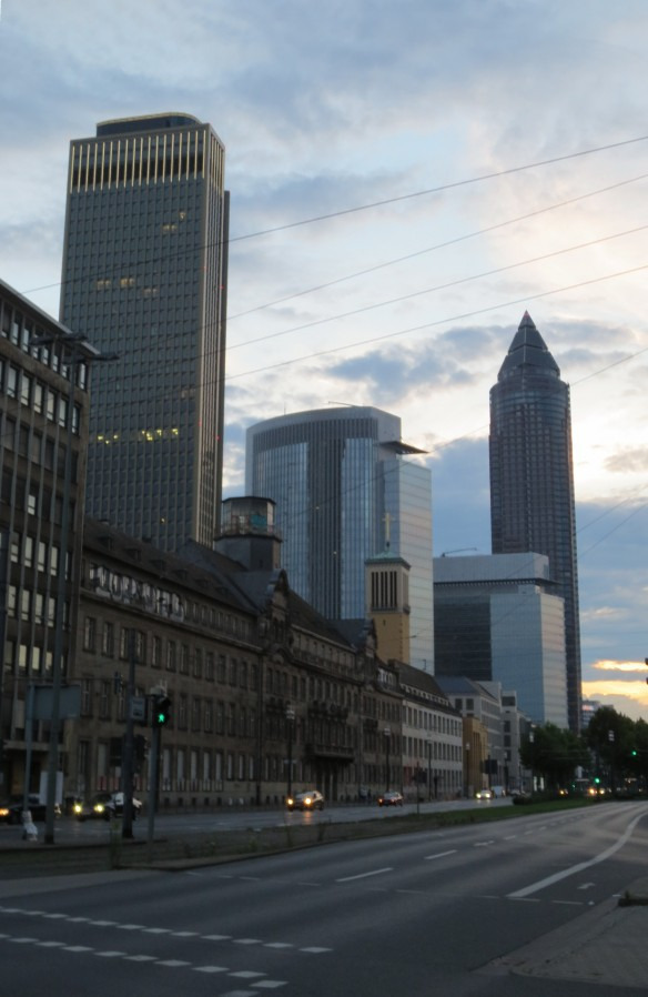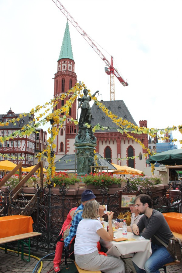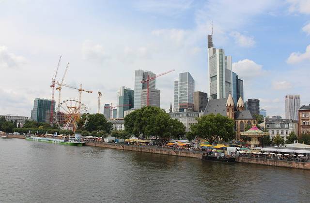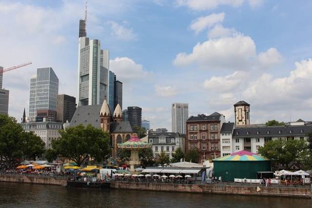 法兰克福是欧洲少数几个新老城区融合的特例之一。在法兰克福市区,即能看到巴洛克式、哥特式等古老的、令人叹为观止的老建筑,也能看到新时代的玻璃大厦。老建筑与新高楼,格子屋与玻璃幕墙,相辅相成,相得益彰,新老城区在这里完美地实现了无缝对接。很难想象,这样一座现代化的大都市几乎是在一片废墟中建设起来的,第二次世界大战中,33次大轰炸摧毁了法兰克福80%的建筑,千年古城,变成一片废墟。战后,法兰克福被迅速重建,发展惊人。作为德国的第五大城市和金融中心,法兰克福有着许多高楼大厦,欧洲最高的十座建筑有8座在法兰克福。现在法兰克福拥有400多家银行,这些高楼大厦,有很多就属于这些银行,体现了企业的实力。德意志联邦银行、欧洲中央银行、UBS瑞士联合银行集团等的大楼就是其中的代表。2013年3月,当我站在爱塞尔纳铁桥上向远处眺望时,新的欧洲央行大楼正处在脚手架的包裹中;2014年8月,当我再次站在铁桥上时,一座崭新的拔地而起的欧洲央行大楼呈现在眼前。现在的法兰克福,依然矗立着许多高大的塔吊,伴随着城市一天天的成长。若干年后,如若我再次来到法兰克福,不知道会有怎样的惊喜?