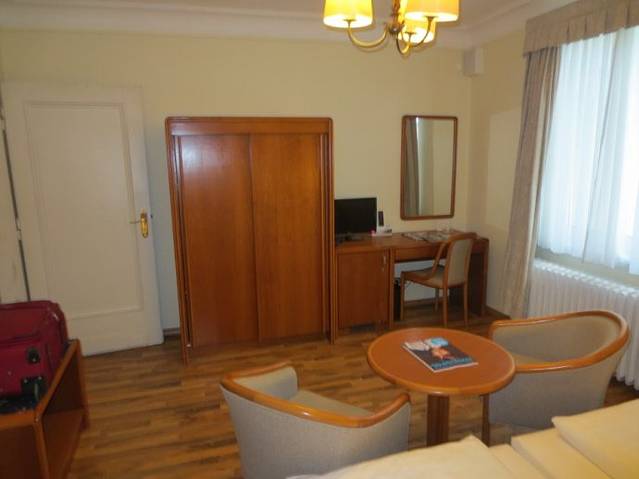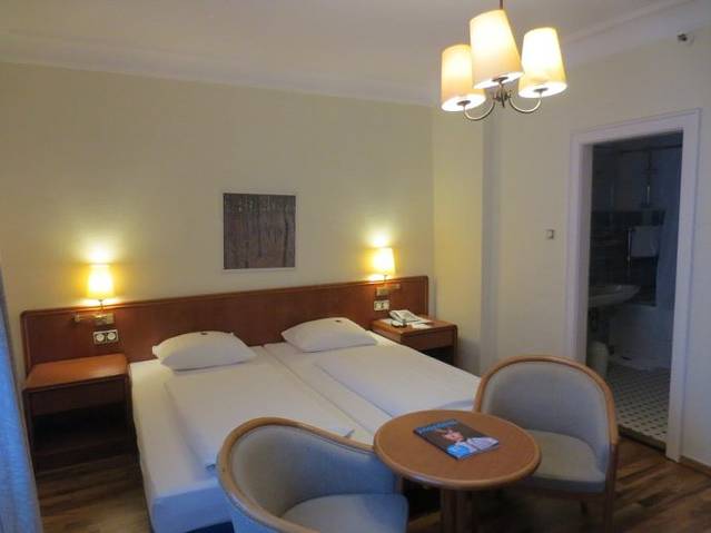 从威斯巴登回到法兰克福终于拿到钥匙住进了我预订的宾馆,房间的设施虽然有些陈旧过时,但房间宽敞明亮,住的很舒服。预订的单人间,告诉前台要吸烟,结果给了个双人间,讲究!最主要的是mini bar里的饮料是免费的,可乐、啤酒、气泡水、果汁、矿泉水一共9瓶,可真够丰富的。赚到了!