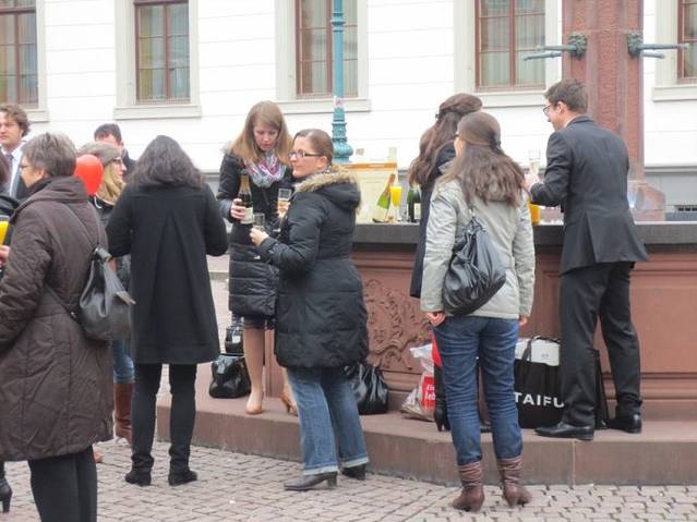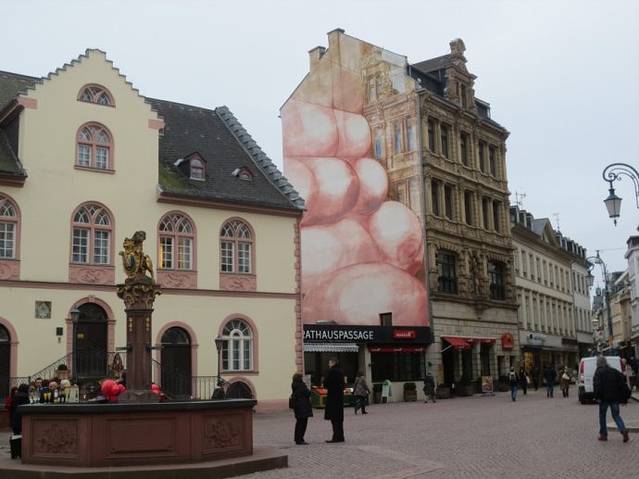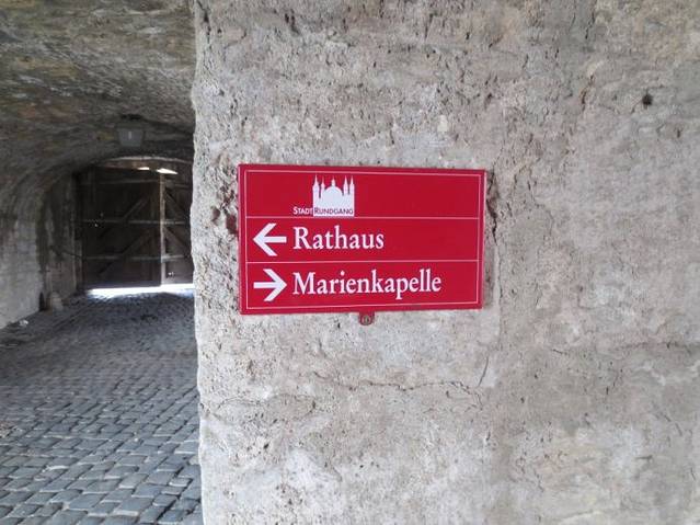 沿着街路,一路走到集市广场(Marktlatz)。集市广场的长椅上三三两两坐着晒太阳的人,大多数是老年人,享受着冬末难得的阳光。由于是周日,旅游问讯处(Information)没有开门,想拿一份城市地图和资料的希望落空了。广场上有一处类似广告牌的牌子,上面标着维尔茨堡的旅游名胜和游城路线。毫不犹豫的拍下来,正好补偿了。