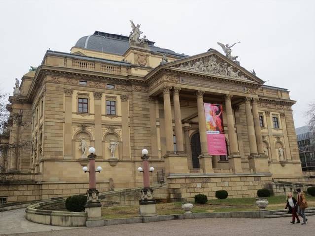 黑森州国家剧院柱廊里的入口处。黑森州国家剧院功能多样,集歌剧院、交响乐和室内音乐厅、话剧院、青少年话剧院、芭蕾舞剧场、舞剧场、新音乐实验剧场、朗诵会场和音乐工作室于一体,旗下还有瓦尔堡小剧场的喜剧场,马尔厅里的午夜剧场,青年实验话剧团,残疾人戏剧交流中心,戏剧学校,戏剧爱好者交流中心,探戈咖啡屋和国际艺术节策划公司。