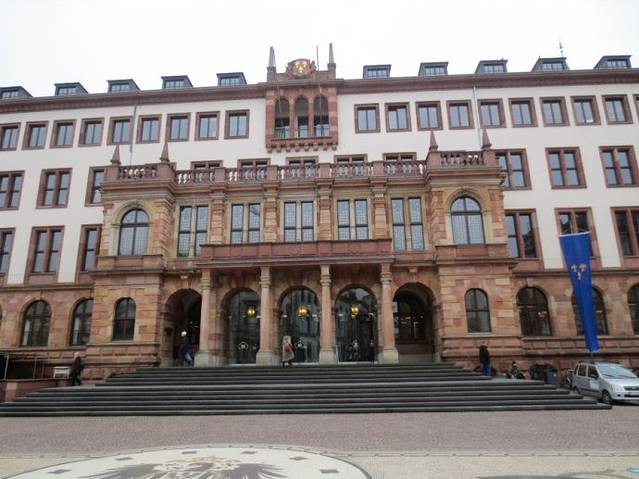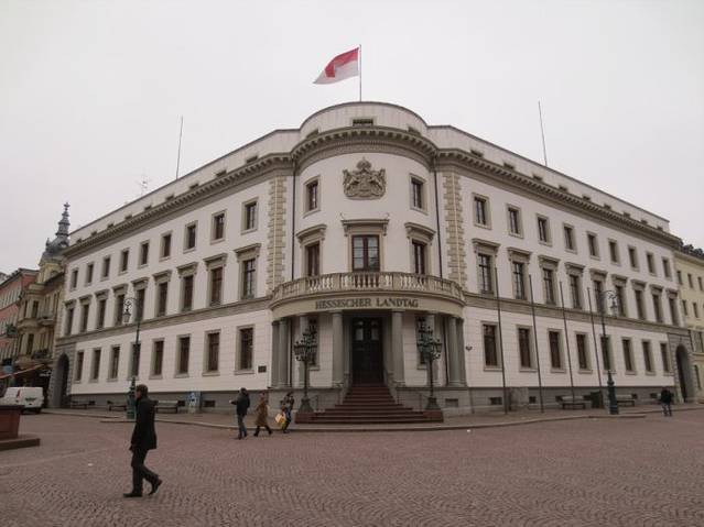黑森州议会大楼(市政宫殿,Stadtschloss),1837年至1842年为拿骚公爵威廉姆建造的城市王宫具有后古典主义的建筑风格,1946年以后,成为黑森州议会的所在地。作为拿骚公爵的官邸,城市王宫外表朴实无华,内部却富丽堂皇,壁画和屋顶壁画都充满了古希腊罗马的艺术风格。二战之后,这里成为了黑森州议会的所在地,1961年,议会新的会议大厅落成,威斯巴登市民和前来参观议会的民众都可以在此旁听。2008年3月,重新修建的新会议大楼正式启用,环境和技术装备得到了极大的改善。